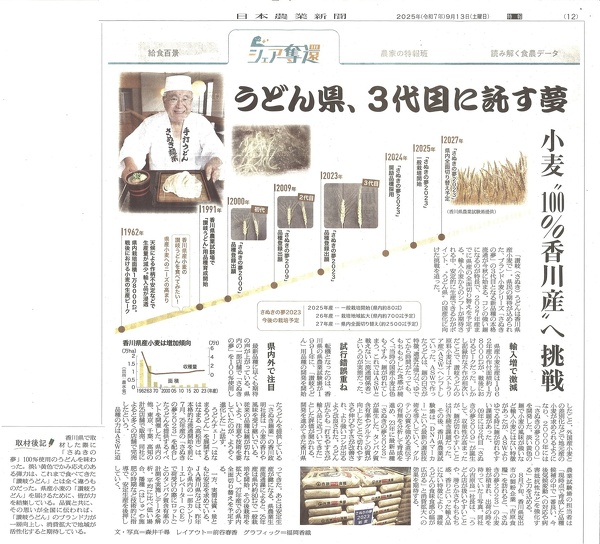 日本農業新聞社(2025年9月13日 付)に香川県産小麦「さぬきの夢2023」に関する記事が掲載されました。弊社 吉原良一は取材において、さぬきの夢2000からの開発経緯と、さぬきの夢2023の優れた特性について説明しました。